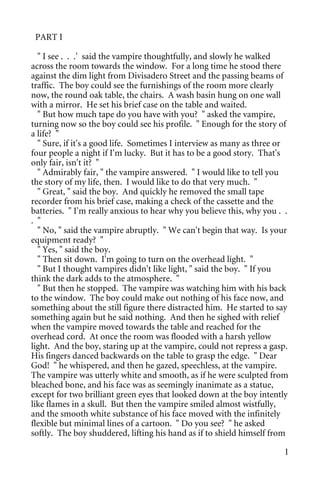 This document provides excerpts from Anne Rice's novel Interview With The Vampire. It describes the backstory of the vampire, who recounts how he became a vampire in 1791 in New Orleans. He tells of how his devout younger brother began having visions and claimed they came from St. Dominic and the Virgin Mary, commanding him to sell their plantations and use the money for God's work. However, the vampire did not believe his brother and angrily dismissed his claims. Upset, his brother ran out of the house and fell to his death from the balcony, turning the vampire who was deeply regretful for not believing his brother.