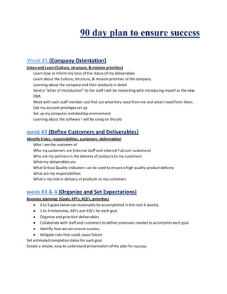 The document provides examples of cover letters and a 90-day plan for a new employee. The 90-day plan outlines goals for the first few weeks such as learning company culture, defining responsibilities and customers, setting goals and metrics, and executing plans to deliver products to customers. It recommends maintaining a rolling 90-day plan to ensure ongoing success.