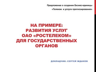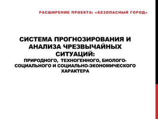 Документ представляет предложение о создании бизнес-единицы «телеком и услуги прогнозирования» на основе развития услуг ОАО «Ростелеком» для государственных органов. Он акцентирует внимание на необходимости разработки системы прогнозирования экстремальных ситуаций различных типов, включая техногенные и природные катастрофы, и описывает подходы к управлению их последствиями. Кроме того, рассматриваются инновационные решения с использованием геоинформационных систем и моделирования для более эффективного реагирования на чрезвычайные ситуации.
