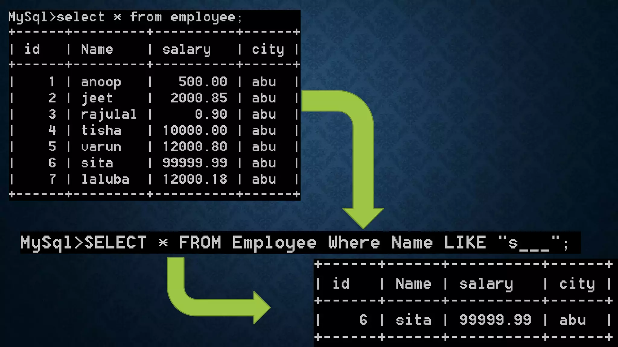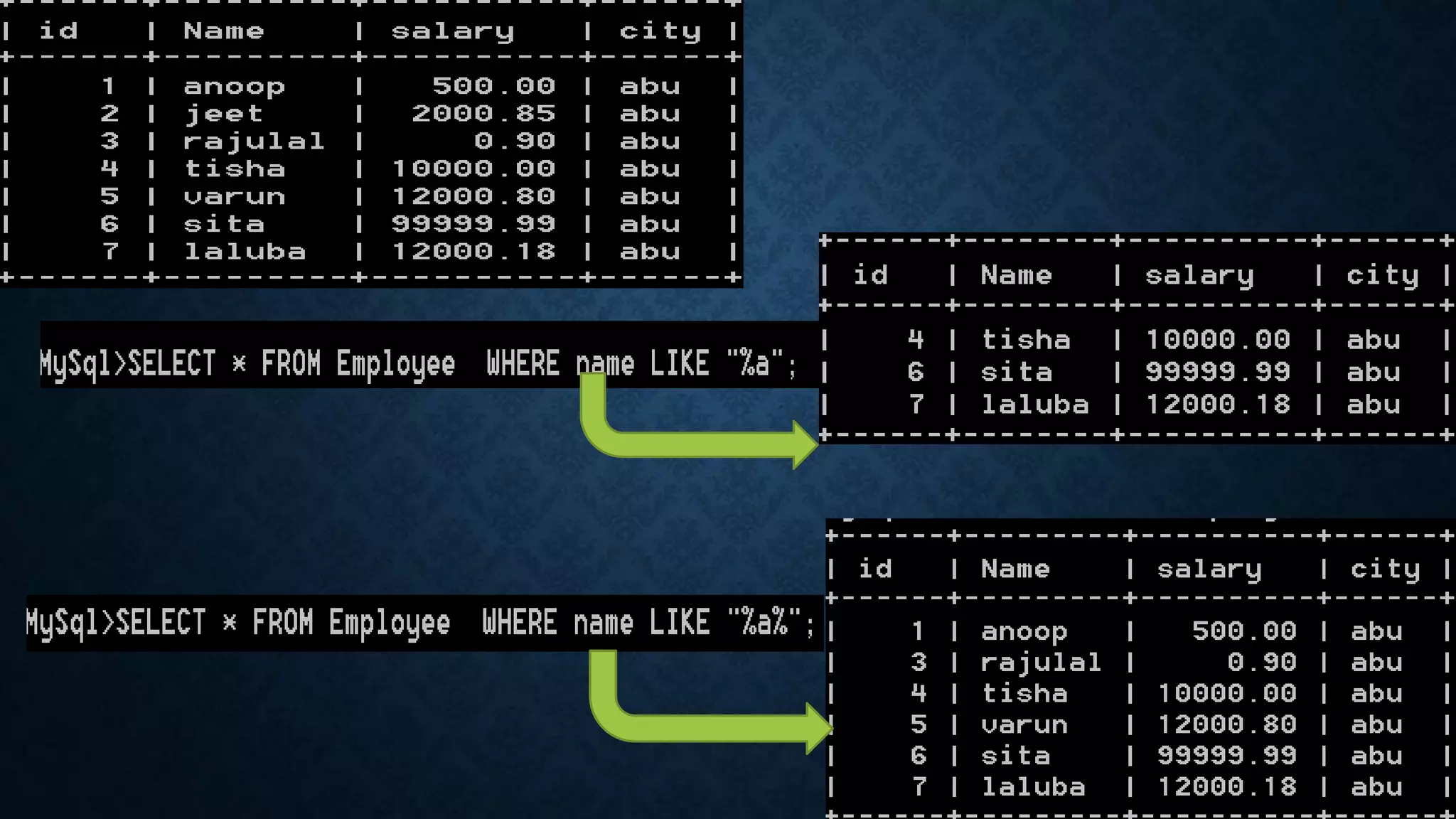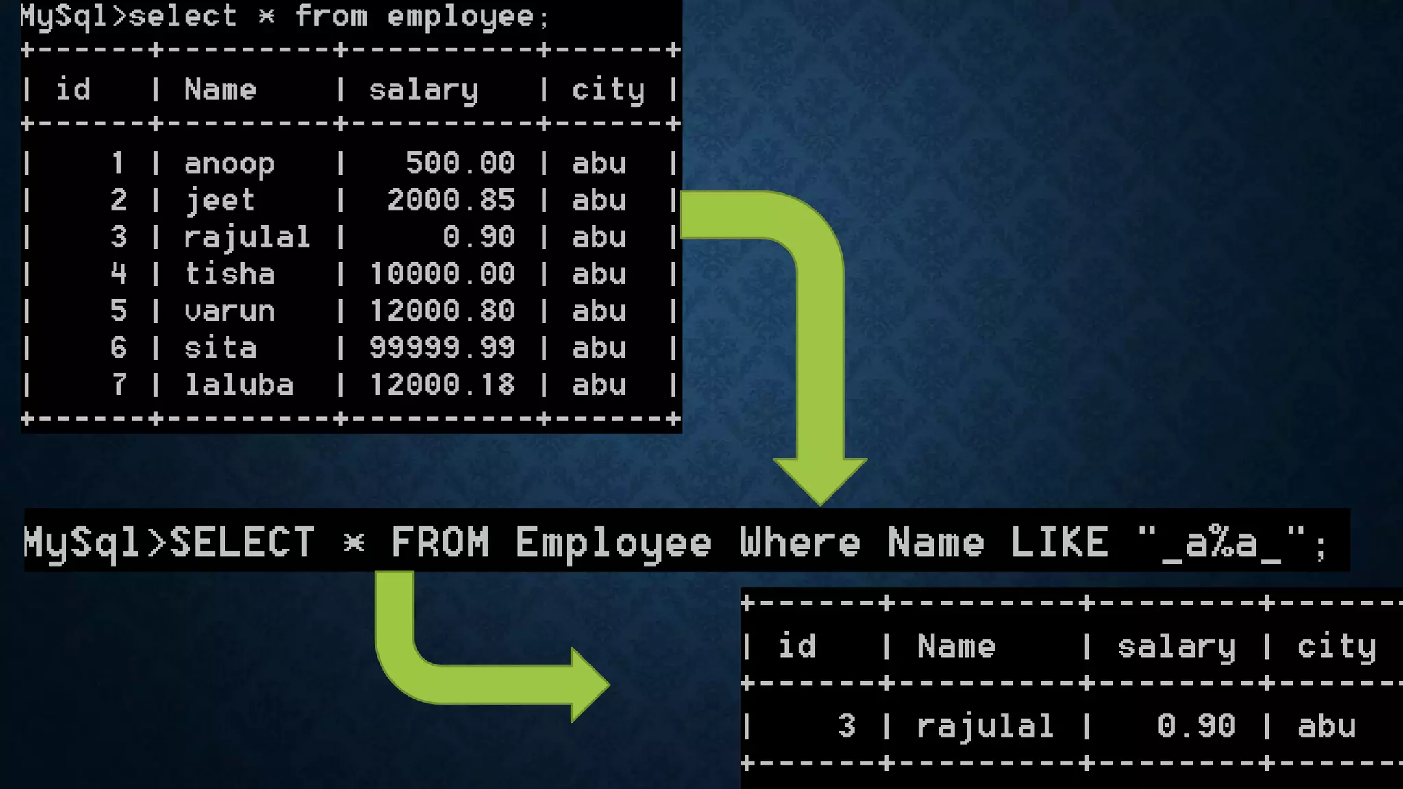 The LIKE operator is used in a WHERE clause to search for a specified pattern in a column using wildcard characters. It uses two wildcards - the percent sign (%) to match any substring and the underscore (_) to match a single character. The percent sign can match any substring, while the underscore matches any single character. Examples show how the LIKE operator with wildcards can be used to search for names starting with "a" or containing "s_ _ _" in a table.