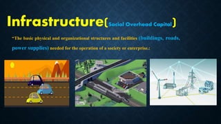 Infrastructure is broadly categorized into economic infrastructure and social infrastructure. Economic infrastructure includes roads, transportation, electricity, and telecommunications to promote economic activity. Social infrastructure supports social services like healthcare, education, housing, and transportation. India has made significant investments in social infrastructure through programs and policies focused on education, health, transportation, power, housing, irrigation, and other social services. However, India still faces challenges in fully achieving goals like universal education and literacy, access to healthcare, and adequate housing and transportation infrastructure to support its growing population. Further collective efforts are needed from the public and government sectors to improve social conditions.