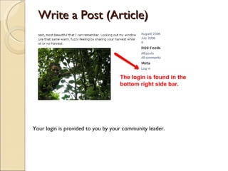 The document provides instructions for writing a post or article on a blogging platform. It explains that the login is found in the bottom right sidebar and is provided by the community leader. It outlines the 3 step process for posting an article: 1) giving it a title, 2) writing the content, and 3) publishing it. It also notes that categories should be assigned and photos can be added by following Flickr instructions.