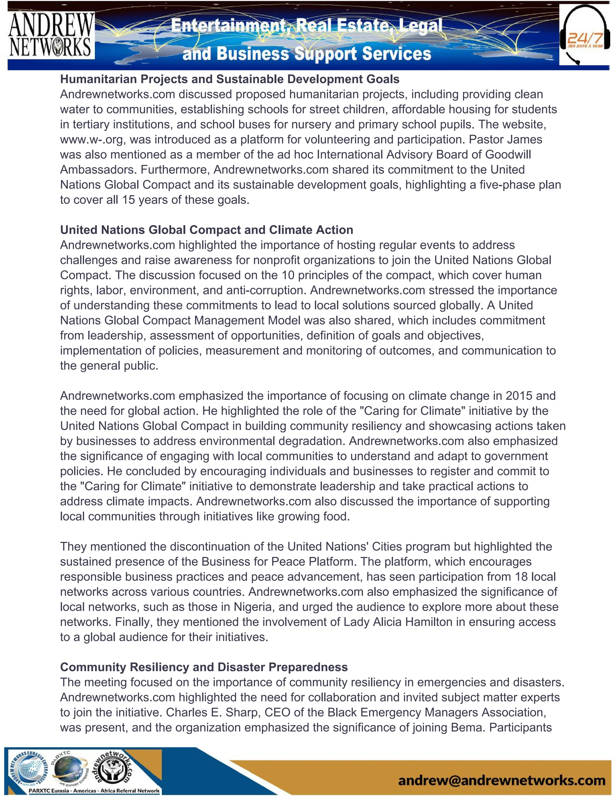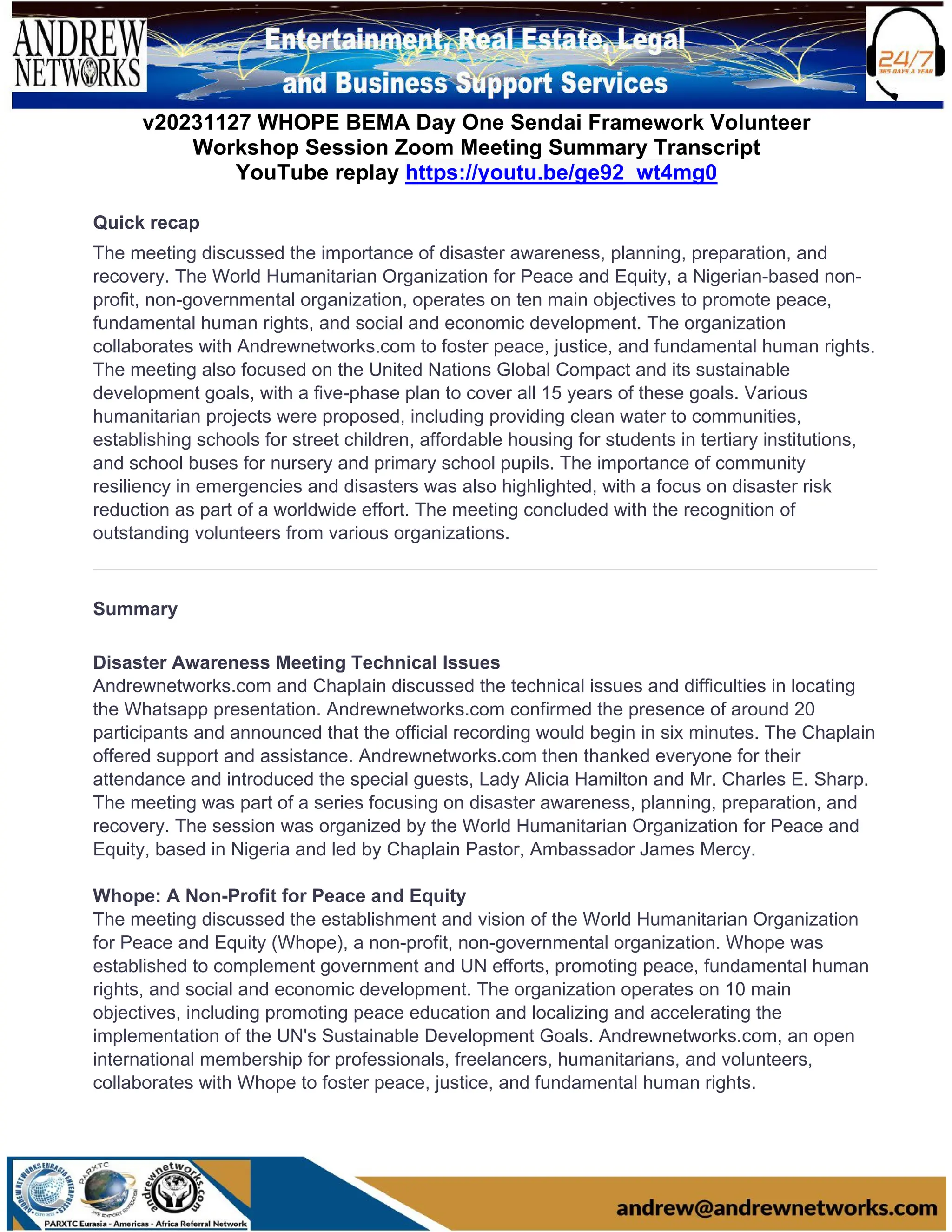 The meeting focused on disaster awareness, planning, preparation, and recovery, organized by the World Humanitarian Organization for Peace and Equity (WHOPE) in collaboration with andrewnetworks.com. Various humanitarian projects were proposed to enhance community resiliency, including providing clean water and educational resources, while also emphasizing the importance of the United Nations Global Compact and its sustainable development goals. Outstanding volunteers were recognized, and participants were encouraged to share personal disaster experiences to foster community involvement in disaster preparedness and response.