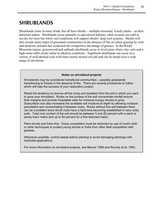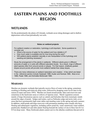 This guide provides information for selecting and establishing native plants in Colorado. It covers plant basics, natural communities in the state, and techniques for revegetation of upland and wetland habitats. The guide includes details on site planning, preparation, seed and plant selection, and monitoring for successful revegetation projects using native species.