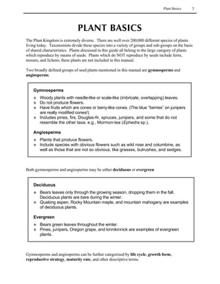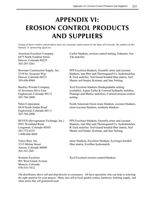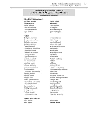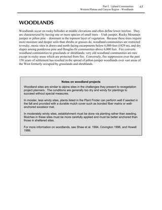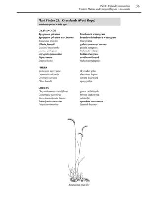 This guide provides information for selecting and establishing native plants in Colorado. It covers plant basics, natural communities in the state, and techniques for revegetation of upland and wetland habitats. The guide includes details on site planning, preparation, seed and plant selection, and monitoring for successful revegetation projects using native species.