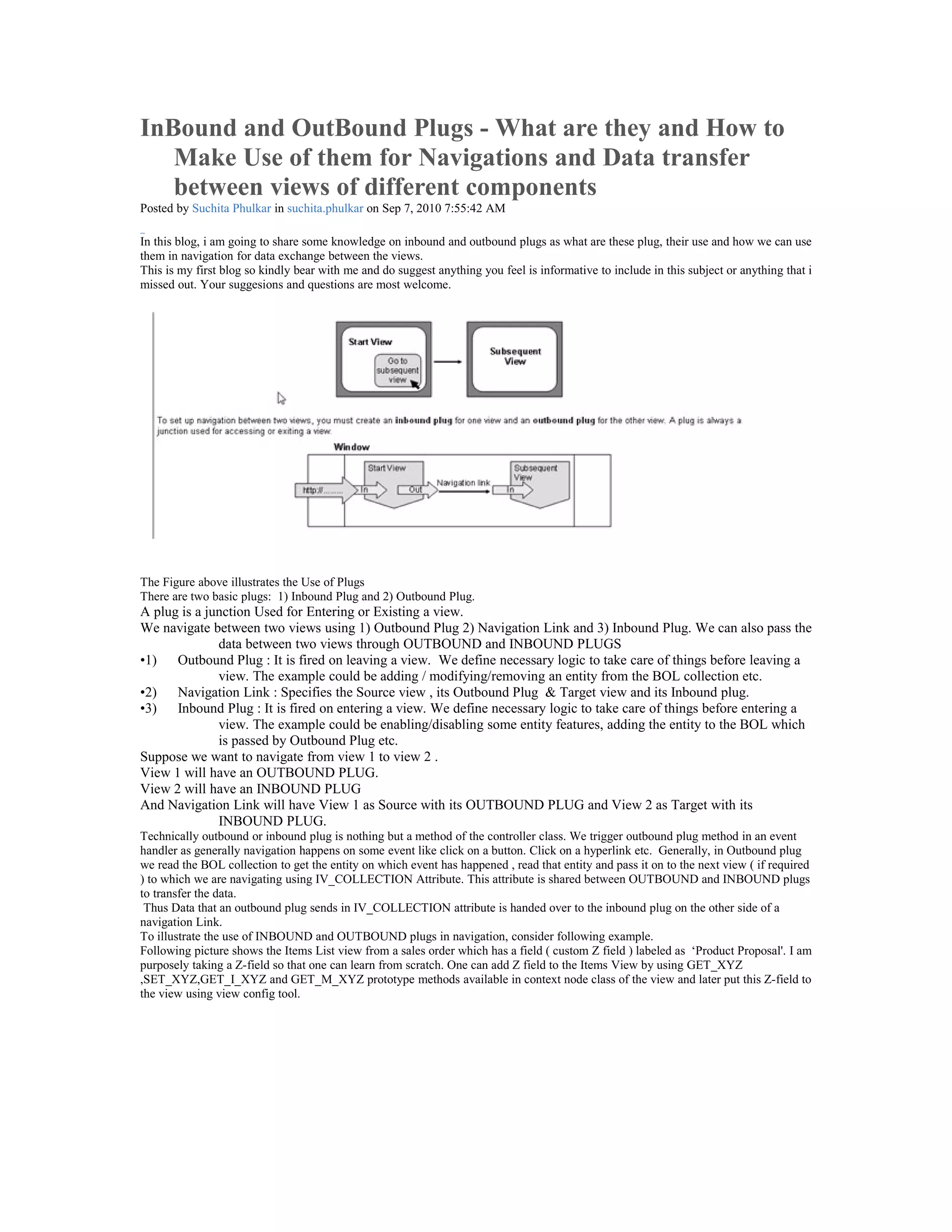 This document discusses inbound and outbound plugs in SAPUI5, which are used for navigation and data transfer between views. It provides an example of using outbound and inbound plugs to navigate from an items list view to a product details view when a product is clicked, and pass the selected product entity between the views. The outbound plug on the items list view passes the product to the inbound plug on the product details view via a shared collection attribute, displaying the correct product details.