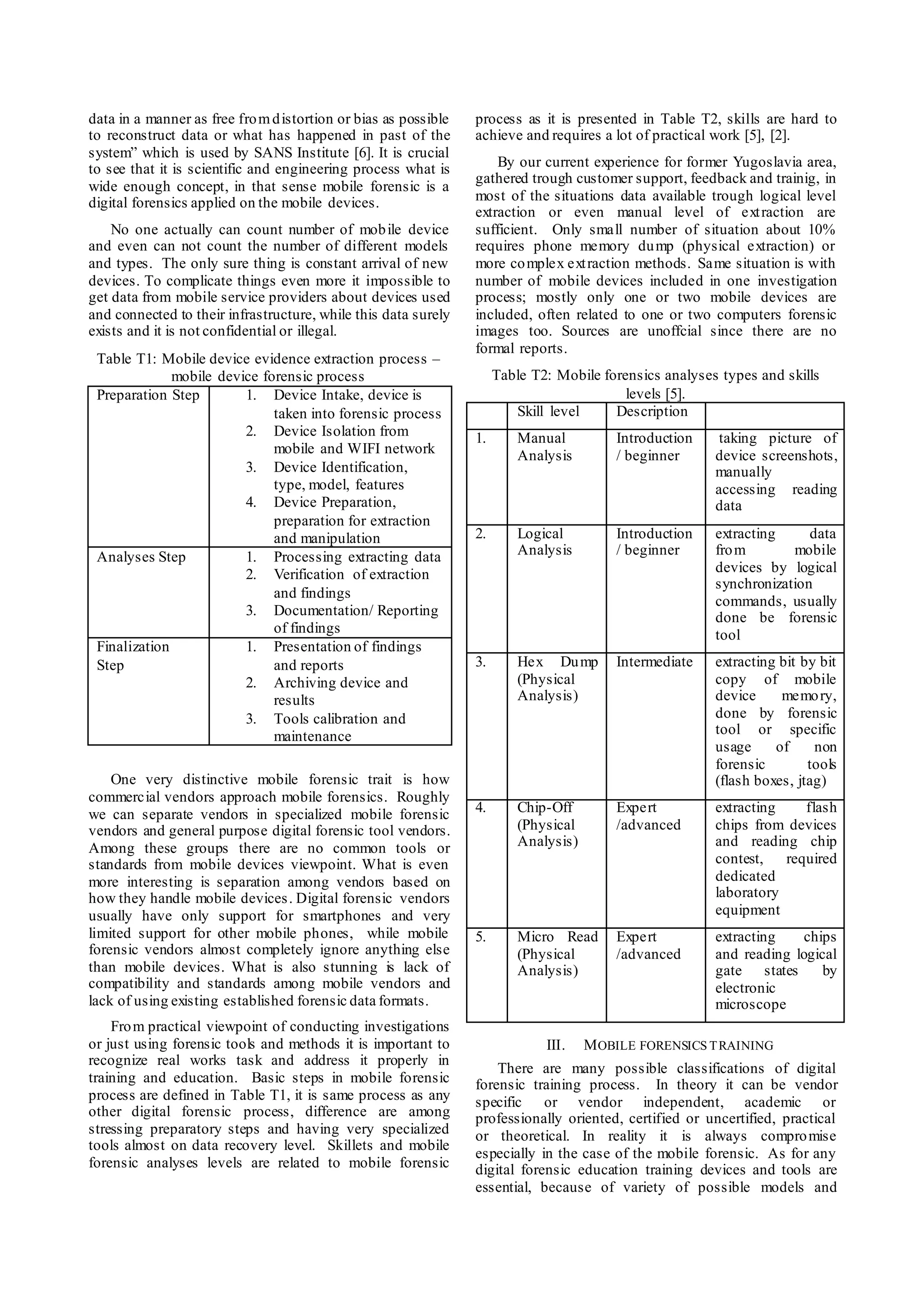 The document discusses the challenges and methodologies in mobile device digital forensics education and training, highlighting the need for standardized tools, methods, and skills in this rapidly evolving field. It emphasizes the importance of effective training programs that incorporate real-life scenarios and continuous education to keep pace with technological advancements. The paper also outlines the specific training requirements for mobile forensics, including the necessity for practical hands-on experience with various mobile devices and forensic tools.