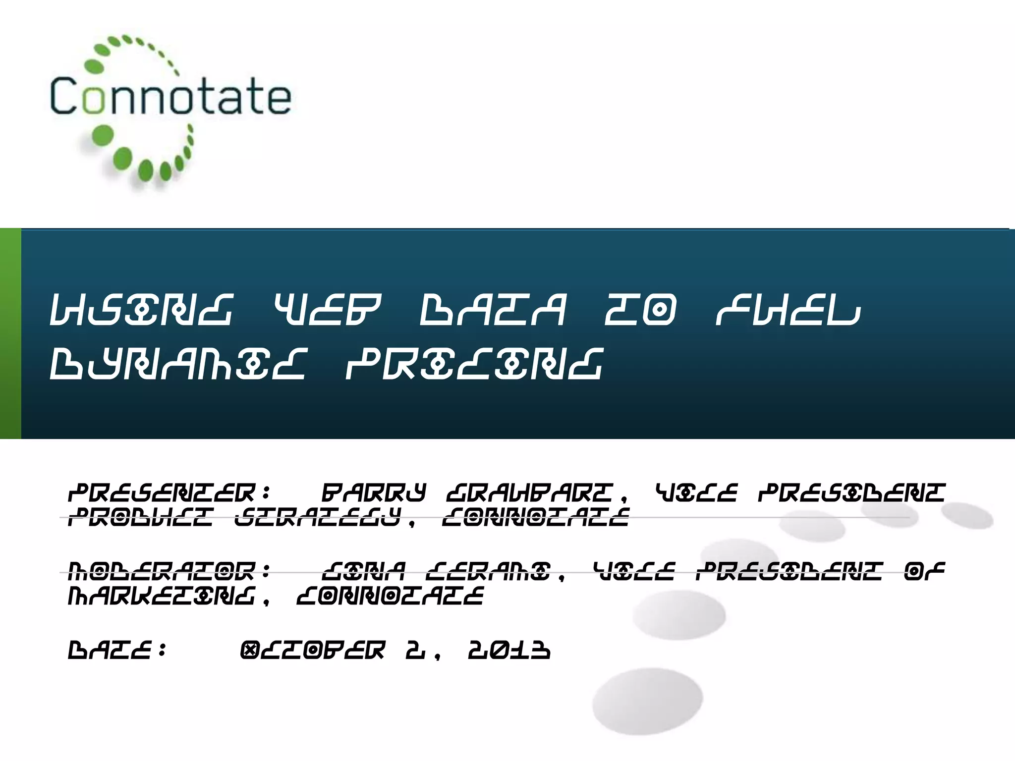 Connotate provides automated web data extraction to help companies gather pricing intelligence from online sources. Their solution allows companies to monitor competitor websites daily to obtain timely pricing data at national and local levels. This enables businesses to optimize their own pricing strategies and maximize profits. Connotate's workflow transforms raw web data into clean, consumable formats that can feed into business intelligence applications. They also highlight new items and price changes to deliver just the changes from the previous data set. Case studies showed how this approach helped a retailer and manufacturer make better pricing and product decisions.