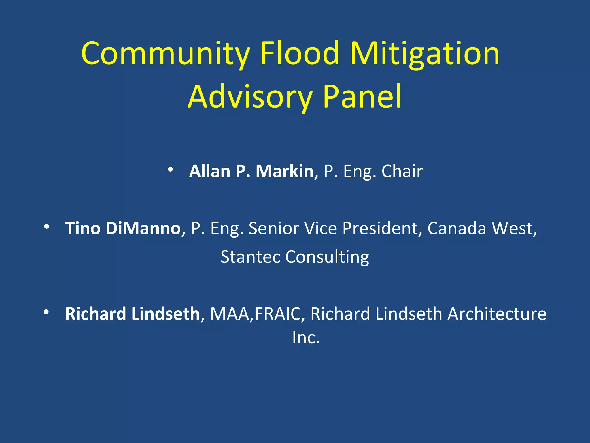 The Community Flood Mitigation Advisory Panel examined leading flood prevention practices and innovative mitigation solutions. They recommend a water system for the Elbow and Highwood River basins combining dry pond detention berms and diversion channels. This includes 3 headwater berms, 2 foothills berms, and 2 diversion channels to protect urban centers. The estimated cost is $660-830 million and could significantly reduce flooding if a similar event to 2013 or 2005 were to occur again. Timely approvals and construction are needed to implement this crucial part of Alberta's flood mitigation system.