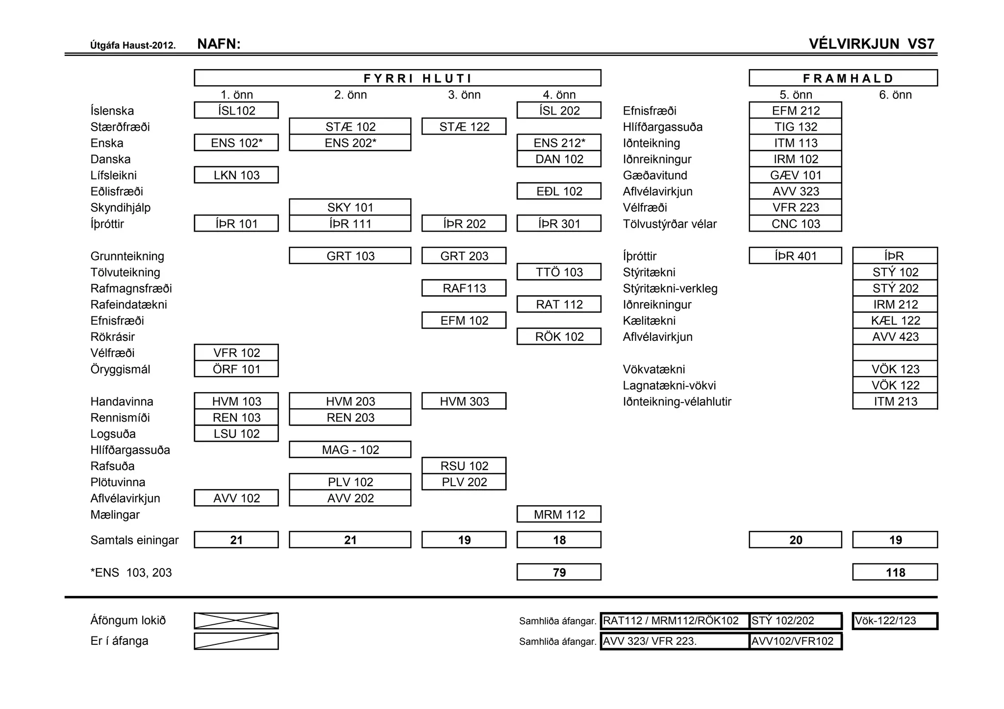 103, 203 NAFN: 1. önn ÍSL102 ENS 102* VÉLVIRKJUN VS7 FYRRI HLUTI 2. önn 3. önn STÆ 102 ENS 202* 4. önn ÍSL 202 STÆ 122 ENS 212* DAN 102 LKN 103 EÐL 102 ÍÞR 202 GRT 103 ÍÞR 101 SKY 101 ÍÞR 111 GRT 203 ÍÞR 301 TTÖ 103 RAF113 RAT 112 EFM 102 RÖK 102 VFR 102 ÖRF 101 HVM 103 REN 103 LSU 102 HVM 203 REN 203 Efnisfræði Hlífðargassuða Iðnteikning Iðnreikningur Gæðavitund Aflvélavirkjun Vélfræði Tölvustýrðar vélar Íþróttir Stýritækni Stýritækni-verkleg Iðnreikningur Kælitækni Aflvélavirkjun FRAMHALD 5. önn 6. önn EFM 212 TIG 132 ITM 113 IRM 102 GÆV 101 AVV 323 VFR 223 CNC 103 ÍÞR 401 Vökvatækni Lagnatækni-vökvi Iðnteikning-vélahlutir HVM 303 ÍÞR STÝ 102 STÝ 202 IRM 212 KÆL 122 AVV 423 VÖK 123 VÖK 122 ITM 213 MAG - 102 AVV 102 PLV 102 AVV 202 RSU 102 PLV 202 MRM 112 21 21 19 18 20 79 19 118 Áföngum lokið Samhliða áfangar. RAT112 / MRM112/RÖK102 STÝ 102/202 Er í áfanga Samhliða áfangar. AVV 323/ VFR 223. AVV102/VFR102 Vök-122/123