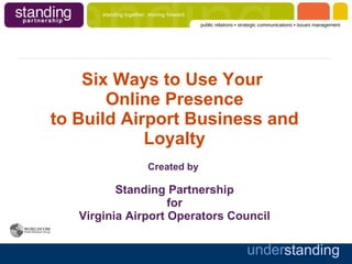 The document outlines six strategies for airport operators to enhance their online presence and foster customer loyalty, including developing a well-integrated website and leveraging social media. It emphasizes the importance of engaging with customers through listening, publishing content, connecting with networks, and evaluating success. The use of social media is highlighted for its potential to improve revenue and SEO effectiveness.