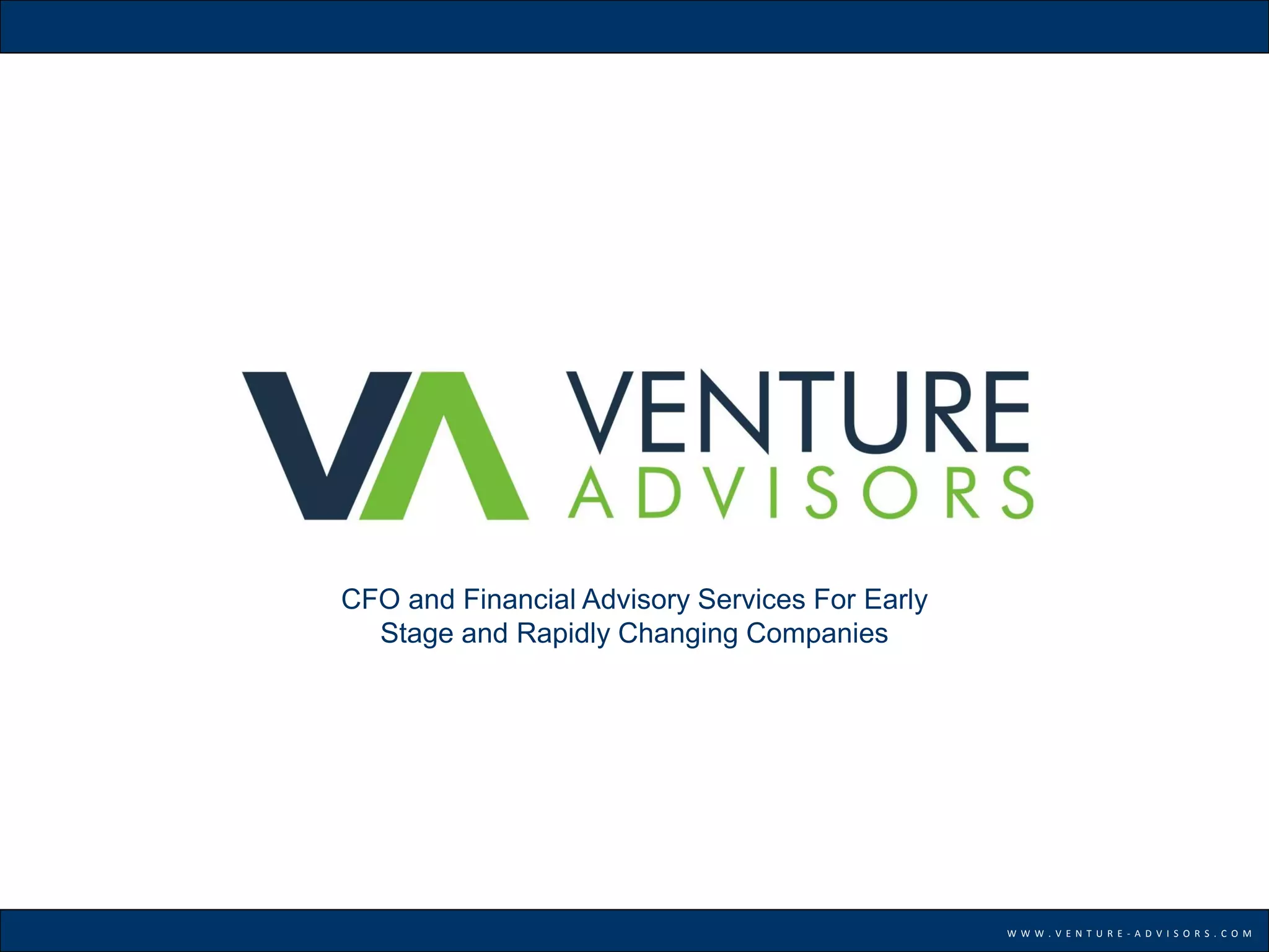 This document describes CFO and financial advisory services provided by Venture Advisors for early stage and rapidly changing companies. Venture Advisors has provided services to over 200 companies across various industries and offers part-time or full-time CFOs, controllers, and other financial professionals. They help companies build and scale their finance teams in a cost-effective manner and provide support during critical events like capital raises, mergers and acquisitions, and IPOs.