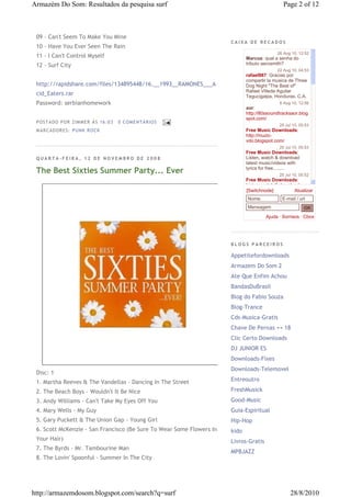 This document is a blog post from Armazém Do Som discussing search results for "surf" and providing related music recommendations. It lists albums such as a 1993 Ramones album, a 1960s summer party compilation in two parts, and a 2008 summer compilation in two CDs. The blog focuses on sharing music files and indicates they are stored online and should only be kept for personal use for 24 hours.
