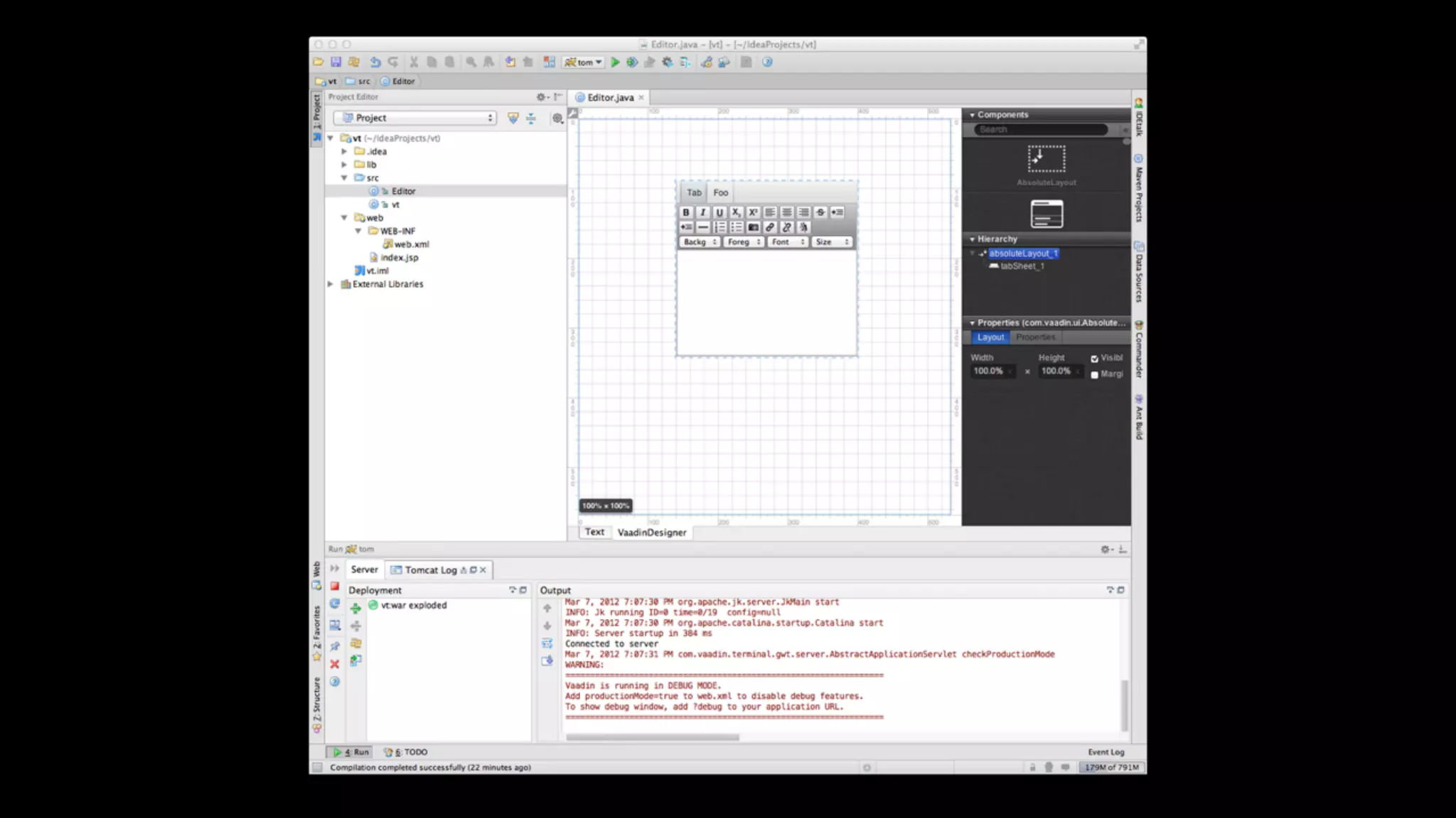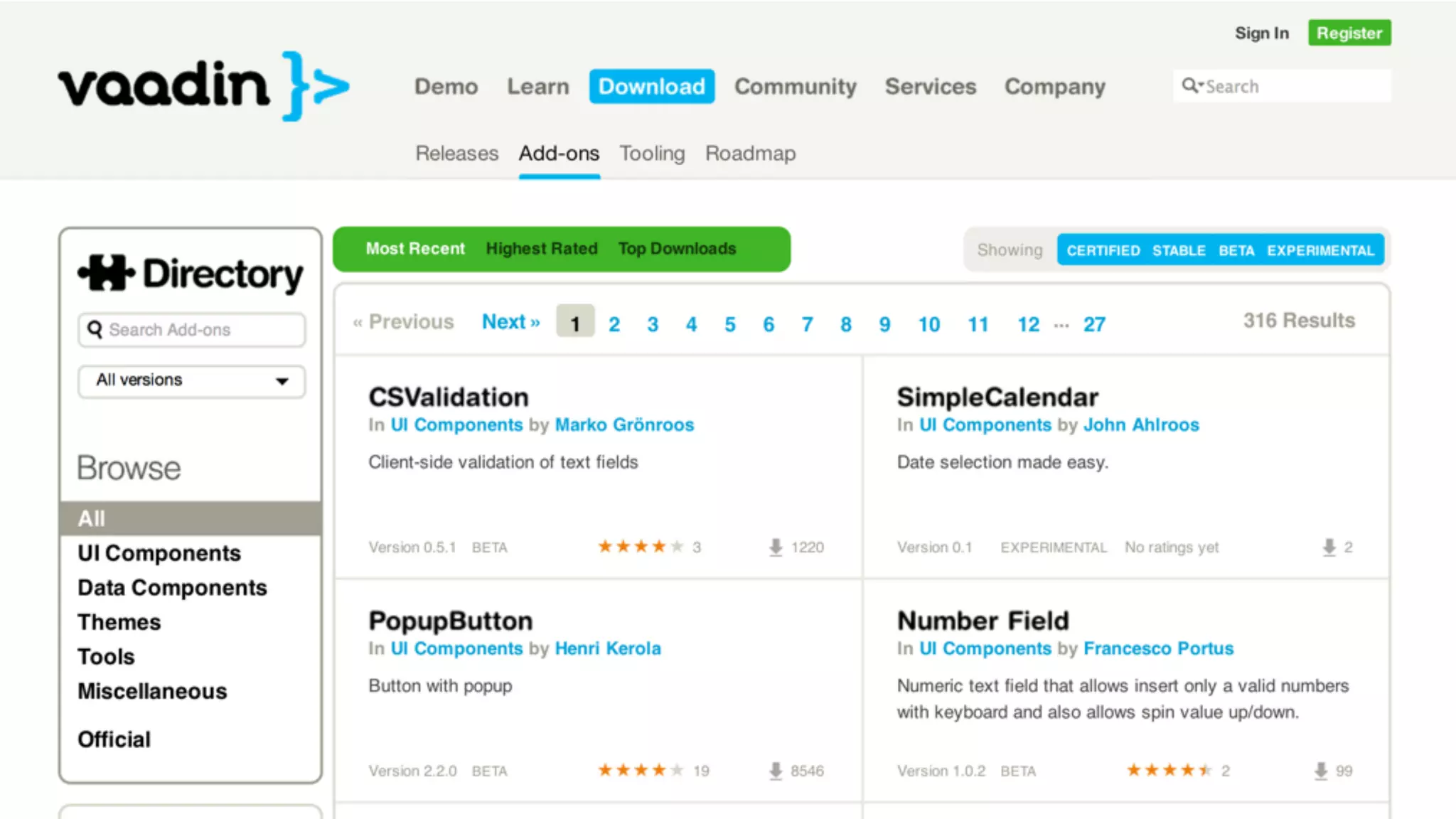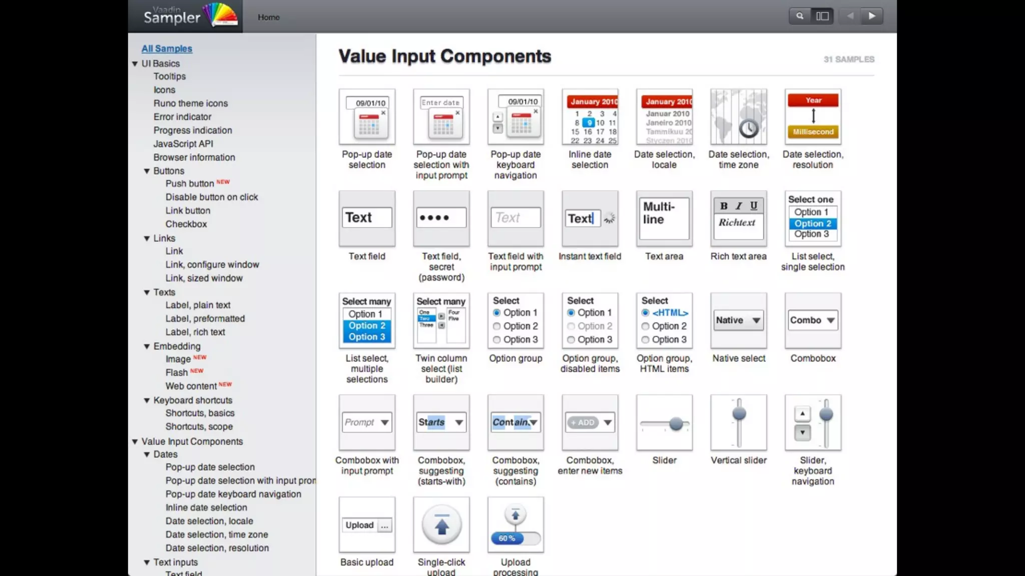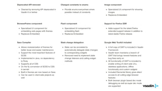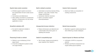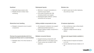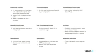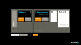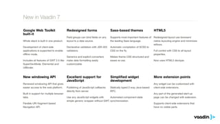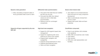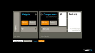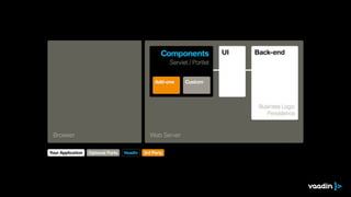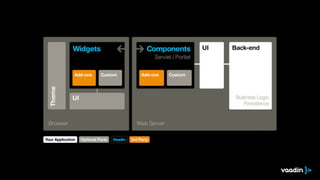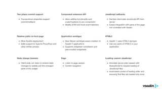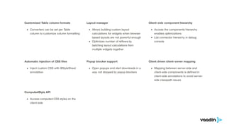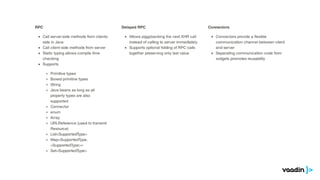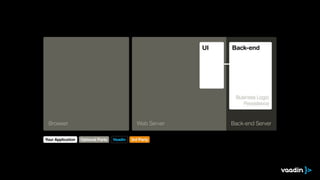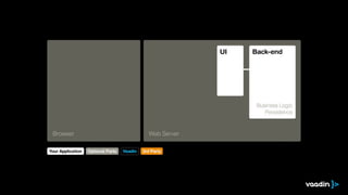 1. Vaadin allows building rich web UIs using Java and HTML. It uses a client-server architecture with the UI running on the server and JavaScript/HTML on the client.