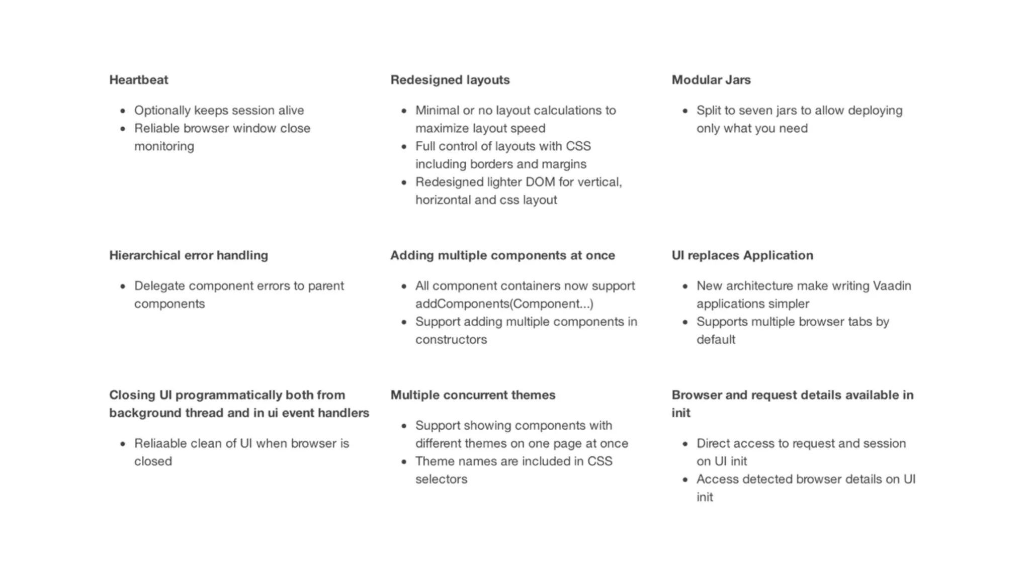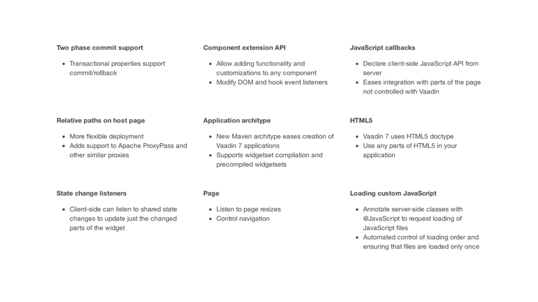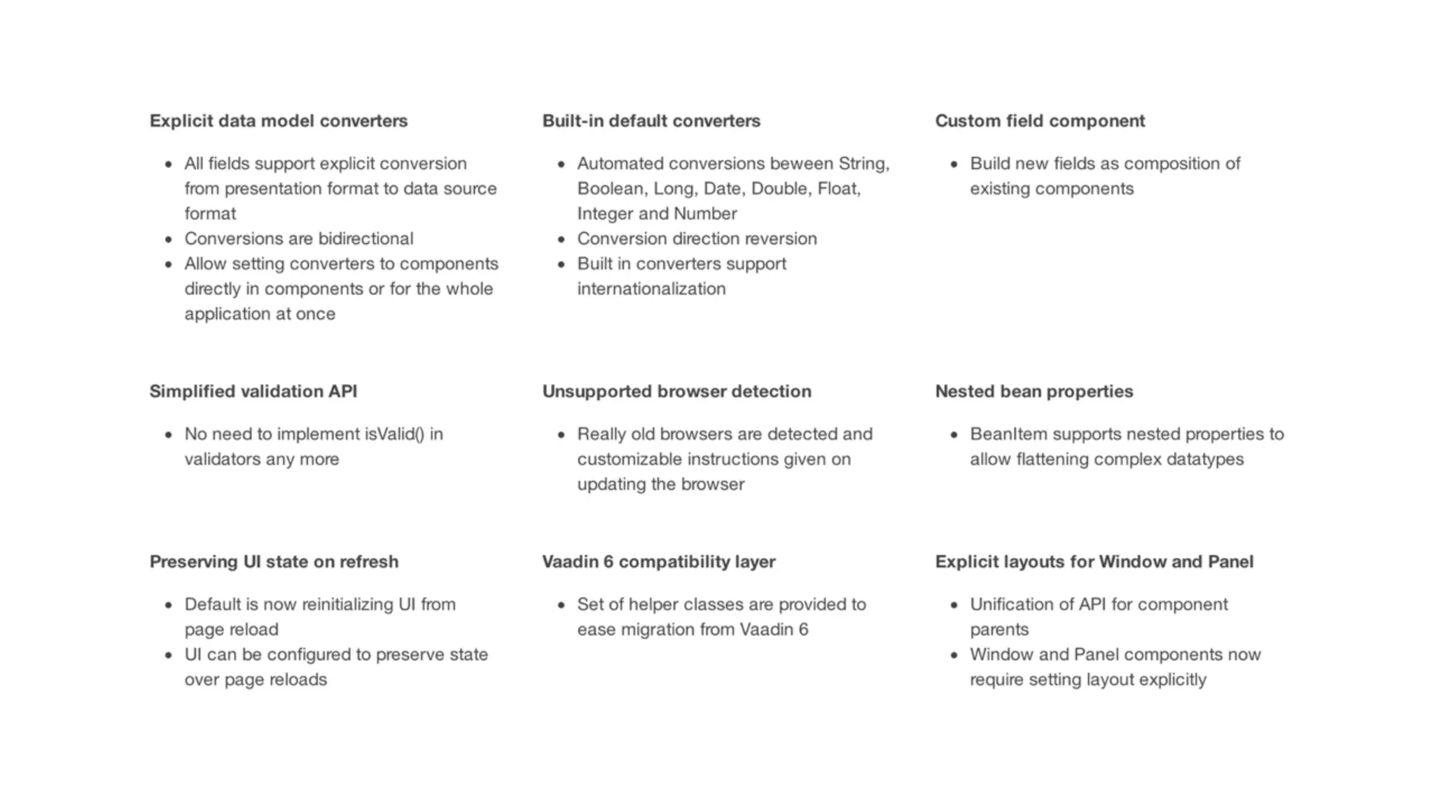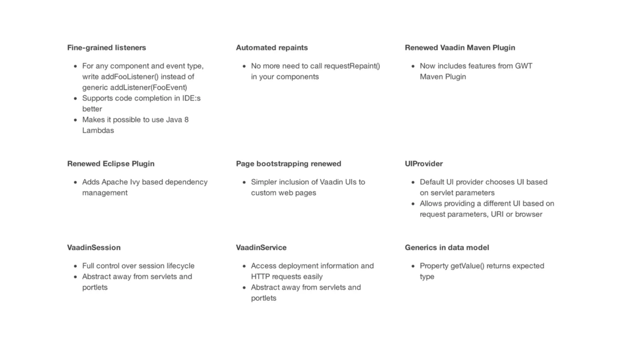 This document provides an introduction to Vaadin, a Java-based web application framework. It highlights key features of Vaadin 7 including rich UI components, support for multiple browsers and devices, built-in themes, and an architecture that separates the user interface from the data model and server communication. The document also summarizes new features in Vaadin 7 such as a windowing API, Sass support, redesign forms, RPC and state handling, and server push capabilities.