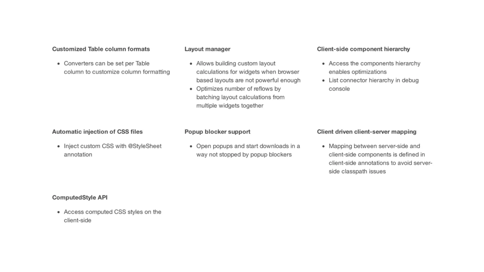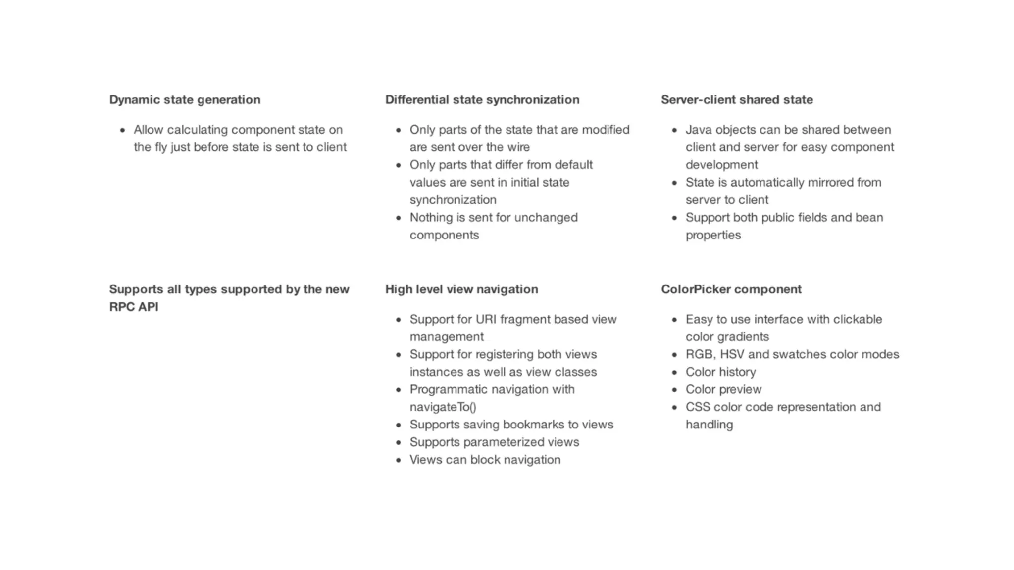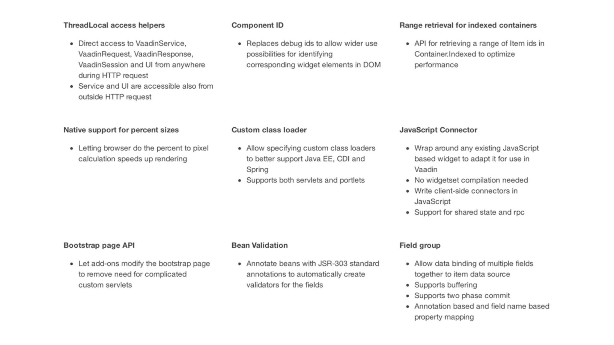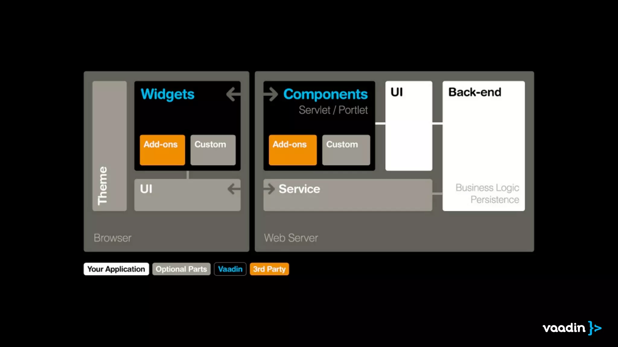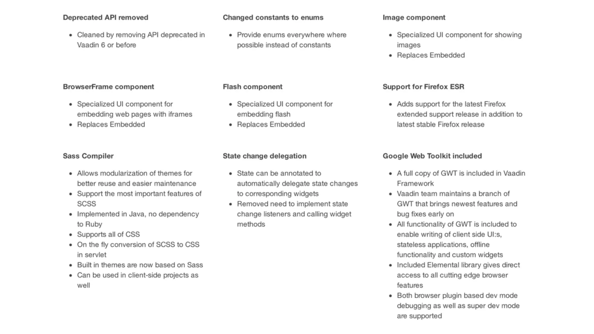 This document provides an introduction to Vaadin, a Java-based web application framework. It highlights key features of Vaadin 7 including rich UI components, support for multiple browsers and devices, built-in themes, and an architecture that separates the user interface from the data model and server communication. The document also summarizes new features in Vaadin 7 such as a windowing API, Sass support, redesign forms, RPC and state handling, and server push capabilities.