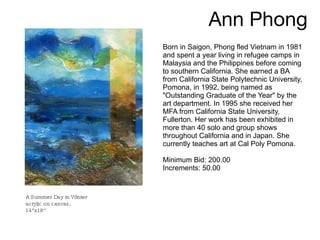 This document provides information on various artworks and artists that are being auctioned to raise funds for VAALA (Vietnamese American Arts & Letters Association). It includes biographies of 14 artists from Vietnam or the Vietnamese diaspora as well as descriptions, minimum bids, and increments for 28 separate artworks. The artworks span various mediums including paintings, photographs, sculptures, and textiles.