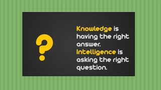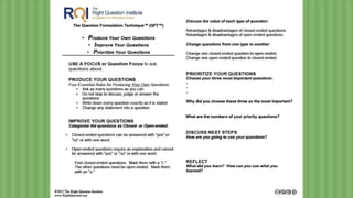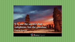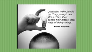 The document discusses getting students to formulate their own questions as an alternative to the traditional Socratic teaching method. It introduces the Question Formulation Technique (QFT), which is a seven-step process for teaching students to generate questions on a given topic. In the QFT process, students first focus on a topic, generate questions about it without overthinking, and then work to improve, prioritize and determine how to use their questions for research, projects and presentations. Formulating their own questions helps students develop important thinking skills like divergent and convergent thinking as well as metacognition.