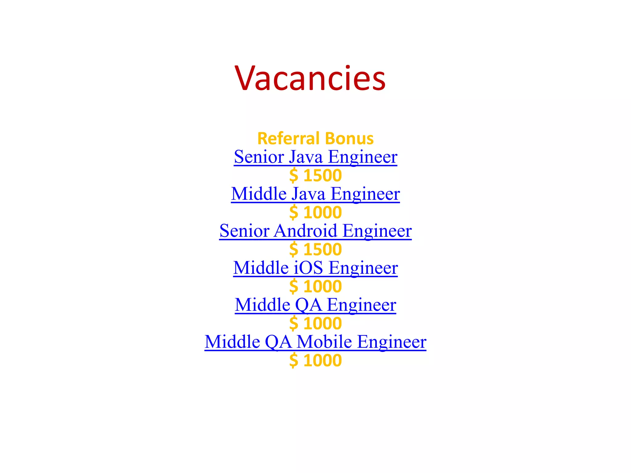 This document lists various engineering and QA positions with referral bonuses. Positions include senior and middle Java, Android, and iOS engineers, as well as QA engineers specializing in mobile. Responsibilities involve developing code and prototypes according to requirements. Required skills are programming experience in relevant languages like Java and C/C++, understanding of software development processes, and strong communication skills. Some positions require specific domain knowledge like experience with certain databases, frameworks, or mobile platforms.