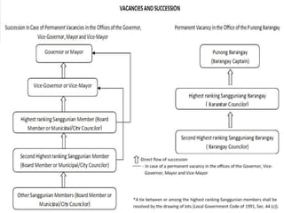 This document discusses vacancies and succession in local government positions in the Philippines. It covers permanent vacancies in offices like governor, mayor, and Sanggunian (council) members, and how they are filled. It also discusses temporary vacancies in the office of the local chief executive when they are incapacitated, and approval of leaves of absence for elective officials. Common elective officials for provinces, cities/municipalities, and barangays are also listed.