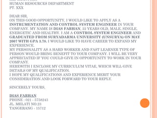 The document contains 4 letters from individuals applying for jobs. The first letter is from Dias Farhan applying to be an instrumentation and control systems engineer. The second is from Asep Catur Putra applying to be an account executive. The third is from Iswandi Lubis applying for an engineering position. The fourth is from Istisari Bulan Lageni applying to be a public relations officer for the Singapore Embassy. All include details of their education backgrounds and relevant experiences for the positions.