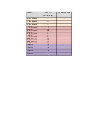 Il documento fornisce un elenco delle prazas (posti) vacanti per diversi corsi di istruzione, tra cui l'educazione infantile e la scuola primaria e secondaria. Sono indicati i posti disponibili per ciascun anno scolastico e grado. I dettagli includono numeri specifici per ogni categoria di istruzione.