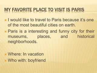 The document discusses Diana Rodriguez's plans to visit Paris, France with her boyfriend. It provides details about some of Paris's most famous landmarks, including the Louvre Museum, Eiffel Tower, Palace of Versailles, and Notre Dame Cathedral. It also mentions the Catacombs of Paris. The document includes a list of things Diana needs to do to prepare for her trip, such as getting a visa and booking travel. It concludes with a list of recommended and necessary items to pack.