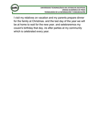The student outlines their plans for upcoming vacations which include visiting relatives, having family dinner at Christmas, celebrating their cousin's birthday on New Year's Eve at home, and attending community end of year parties.