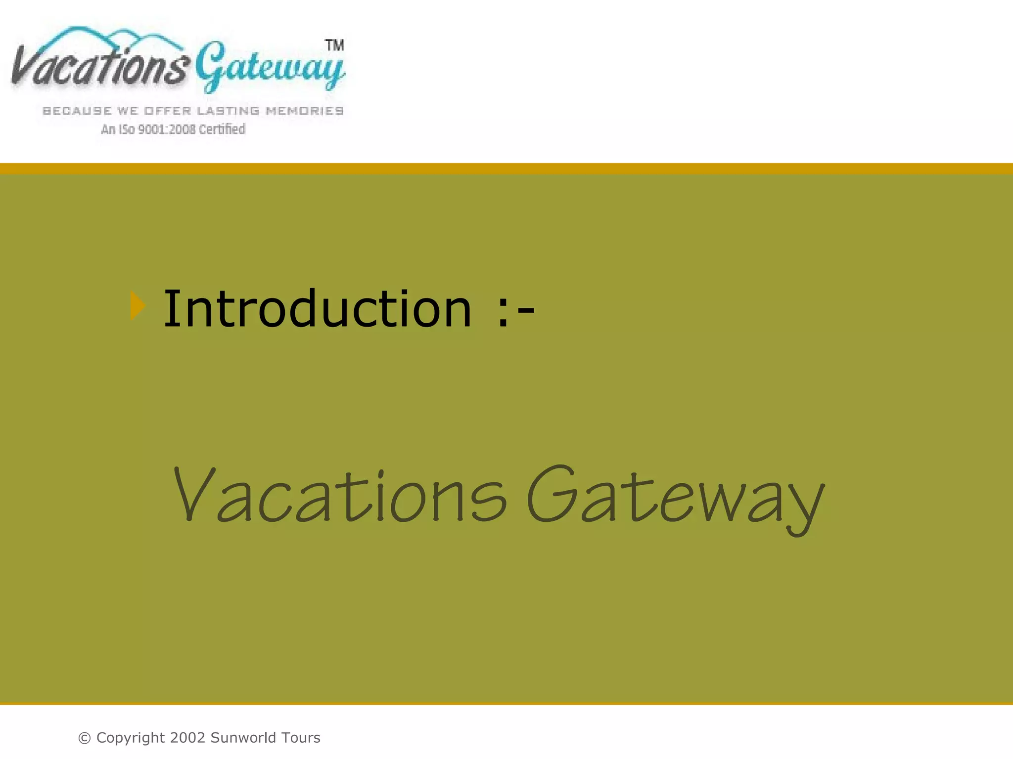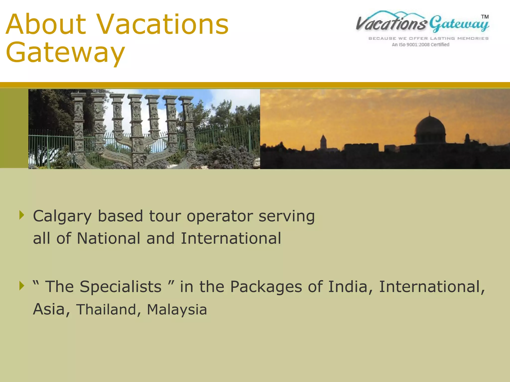 Vacations Gateway is a Calgary-based tour operator specializing in national and international travel packages, particularly to destinations like India and Southeast Asia. With 15 years of experience, they offer customized tours and emphasize customer satisfaction through skilled staff and personalized service. The company also collaborates with various organizations and provides extensive support for group leaders, including free trips and printed materials.