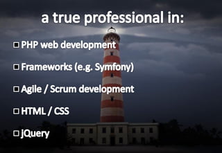 The document describes a company focused on creating high-quality web software that enhances workflow efficiency. It emphasizes the importance of intrinsic motivation, project management skills, and continuous self-improvement through training. The company is seeking individuals who are passionate about coding and eager to engage in exciting projects for serious clients.