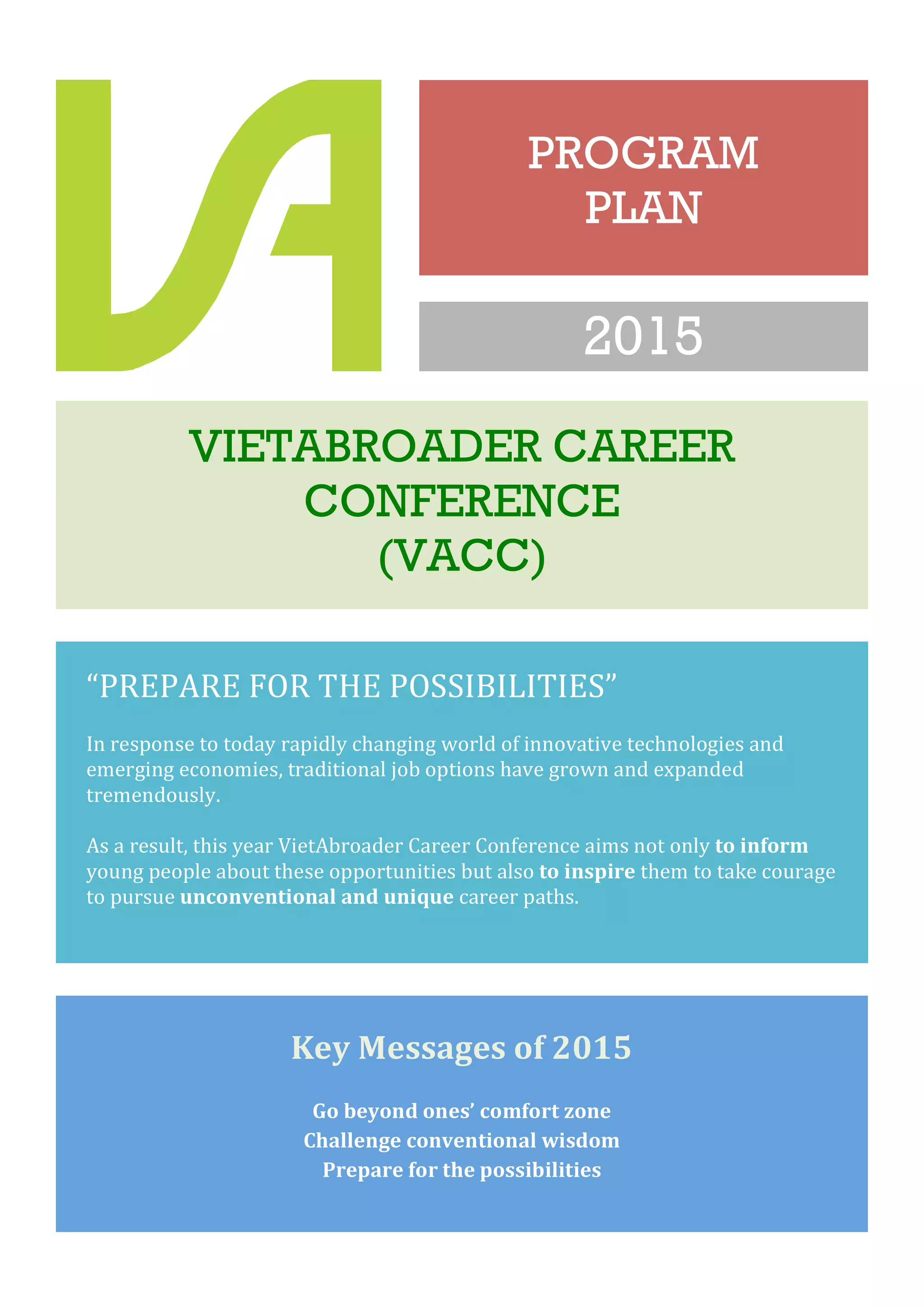 This document outlines plans for the VietAbroader Career Conference (VACC) 2015. VACC aims to help Vietnamese college students prepare for their careers by providing skills training, networking opportunities, and knowledge about the job market. The 2014 conference was successful, with over 200 participants and 30 guest speakers from various industries. VACC 2015 aims to build on this by targeting both local and overseas students, offering guidance across more industries, and providing broader perspectives on career options. It will feature online workshops, an inspirational training day, a main conference day with industry professionals, and opportunities to connect with potential employers.