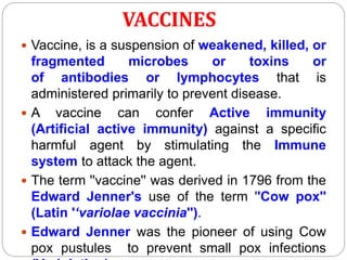 Vaccines work by exposing the immune system to weakened or killed forms of pathogens to stimulate antibody production against them. There are several types of vaccines including live attenuated vaccines using weakened live pathogens, inactivated vaccines using killed pathogens, subunit vaccines using pathogen proteins, DNA vaccines using genetic material, synthetic peptide vaccines, and toxoid vaccines using inactivated bacterial toxins. Vaccines provide active immunity and are the most effective method of preventing infectious diseases.