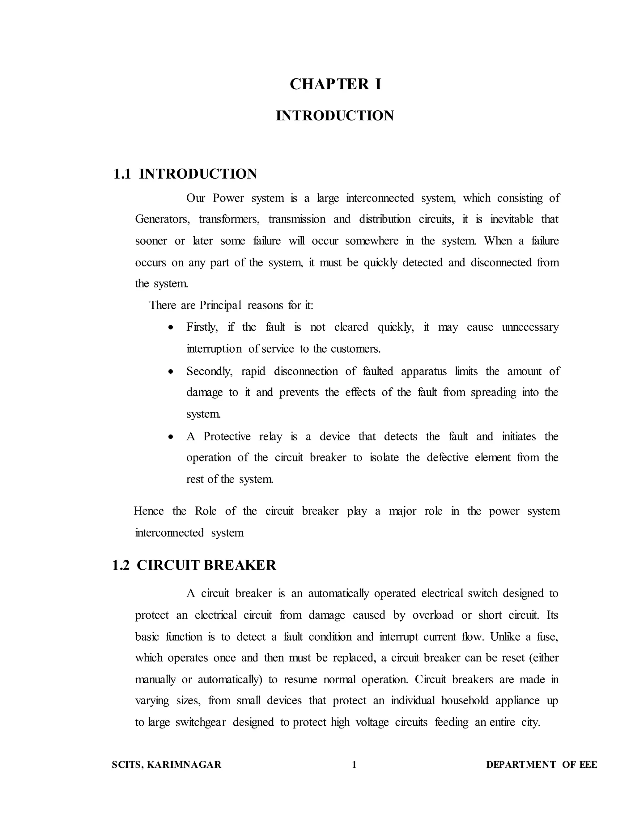 This document provides an overview of circuit breakers and their role in power systems. It discusses that circuit breakers are used to detect faults and quickly disconnect faulty equipment to prevent damage and service interruptions. They can be reset to resume normal power flow unlike fuses. The document then describes that circuit breakers must be able to safely interrupt high short circuit currents without being damaged. It explains that circuit breakers use various techniques like oil, gas, vacuum or air to quickly extinguish arcs during interruption of high fault currents.