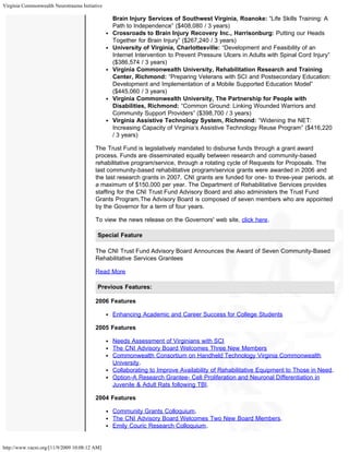 The Commonwealth Neurotrauma Initiative (CNI) in Virginia has allocated $2.8 million in grants to eight organizations to enhance community-based services for individuals with traumatic brain and spinal cord injuries. The funding supports various projects, including life skills training and educational initiatives for veterans. Grants are administered by a governor-appointed advisory board, and the CNI aims to address the growing needs of this disability population.