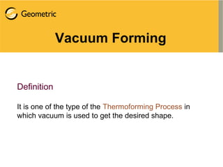 Vacuum forming is a thermoforming process that uses vacuum pressure to mold a plastic sheet over a mold. The process involves heating a plastic sheet until soft, draping it over a mold, applying vacuum pressure to suck the sheet onto the mold, then cooling and ejecting the molded part. Key aspects of vacuum forming include part and tool design, material selection, and processing techniques like heating, vacuum application, and cooling. Common applications are food containers, baths, vehicle interiors, and more.