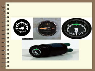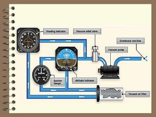 Vacuum systems are used to spin the gyroscopes in flight instruments. An engine-driven vacuum pump creates suction that draws air through the gyros, causing the rotors to spin at high speeds similarly to a waterwheel. This spinning allows the gyros to accurately sense aircraft attitude and heading. Vacuum pressure is monitored with a gauge and should be maintained between 4.5-5.5 inches of mercury. Low vacuum pressure can cause gyroscopic instruments to function unreliably.