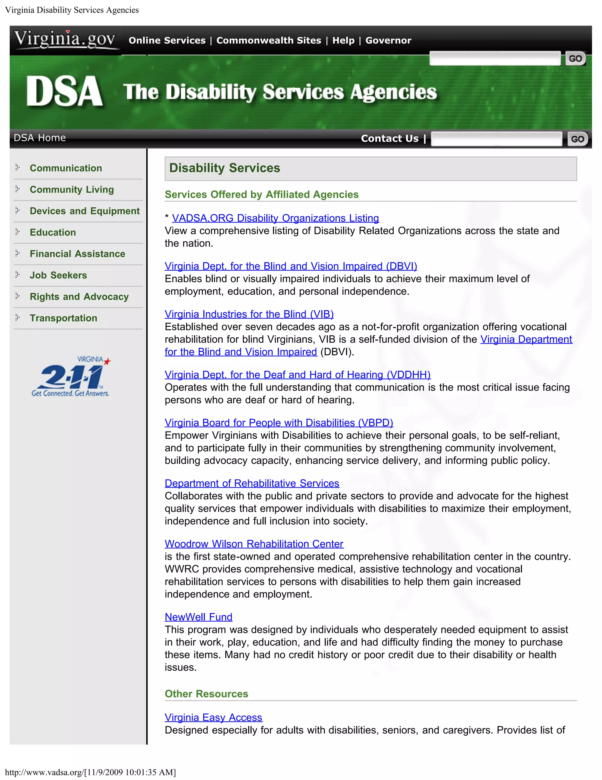 The document lists several Virginia state agencies and organizations that provide services and support for people with disabilities. These include the Virginia Department for the Blind and Vision Impaired, Virginia Industries for the Blind, Virginia Department for the Deaf and Hard of Hearing, Virginia Board for People with Disabilities, Department of Rehabilitative Services, Woodrow Wilson Rehabilitation Center, and others. The agencies and organizations offer services such as vocational rehabilitation, assistive technology, advocacy, education, and information/referral resources.