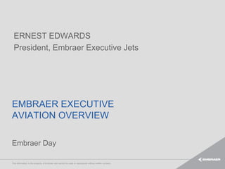 The document provides an overview of Embraer Executive Jets. It discusses Embraer's vision to become a major player in the business aviation market by 2015 through innovative products and services. It outlines Embraer's strategic pillars of improving customer experience and business profitability. It also provides market forecasts, discussing Embraer's product portfolio and programs.