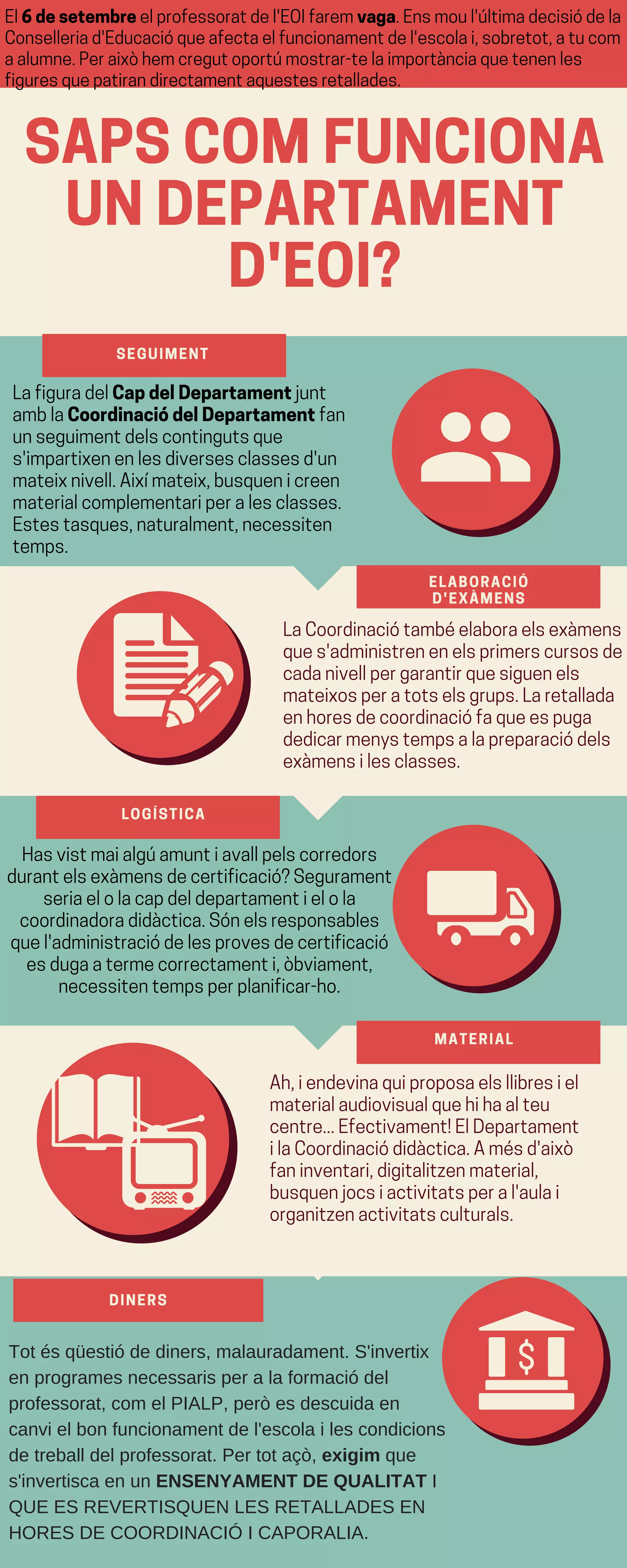 SAPSCOMFUNCIONA UNDEPARTAMENT D'EOI? SEGUIMENT El6desetembreelprofessoratdel'EOIfaremvaga.Ensmoul'últimadecisiódela Conselleriad'Educacióqueafectaelfuncionamentdel'escolai,sobretot,atucom aalumne.Peraixòhemcregutoportúmostrar-telaimportànciaquetenenles figuresquepatirandirectamentaquestesretallades. LafiguradelCapdelDepartamentjunt amblaCoordinaciódelDepartamentfan unseguimentdelscontingutsque s'impartixenenlesdiversesclassesd'un mateixnivell.Aixímateix,busquenicreen materialcomplementariperalesclasses. Estestasques,naturalment,necessiten temps. ELABORACIÓ D'EXÀMENS LOGÍSTICA MATERIAL DINERS LaCoordinaciótambéelaboraelsexàmens ques'administrenenelsprimerscursosde cadanivellpergarantirquesiguenels mateixosperatotselsgrups.Laretallada enhoresdecoordinaciófaqueespuga dedicarmenystempsalapreparaciódels exàmensilesclasses. Ah,iendevinaquiproposaelsllibresiel materialaudiovisualquehihaalteu centre...Efectivament!ElDepartament ilaCoordinaciódidàctica.Amésd'això faninventari,digitalitzenmaterial, busquenjocsiactivitatsperal'aulai organitzenactivitatsculturals. Hasvistmaialgúamuntiavallpelscorredors durantelsexàmensdecertificació?Segurament seriaelolacapdeldepartamentielola coordinadoradidàctica.Sónelsresponsables quel'administraciódelesprovesdecertificació esdugaatermecorrectamenti,òbviament, necessitentempsperplanificar-ho. Tot és qüestió