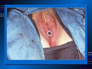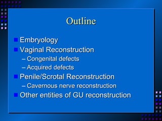 This document provides an overview of vaginal and genitourinary reconstruction techniques. It discusses the embryology and anatomy of the genital tract. It then covers various congenital defects including vaginal agenesis, ambiguous genitalia, and bladder exstrophy. Surgical techniques for vaginal reconstruction include serial dilation, bowel flaps, local flaps, and the McIndoe technique using a skin graft. Acquired defects from cancer or trauma can be addressed with skin grafts or flaps from the vulva, vaginal vault, penis, or scrotum. Goals of reconstruction include wound coverage and restoration of function.