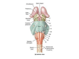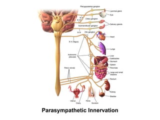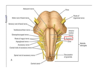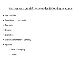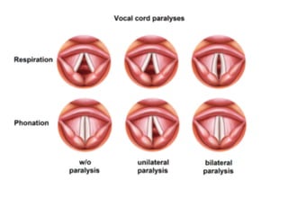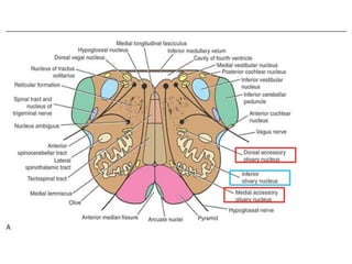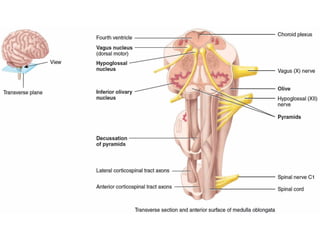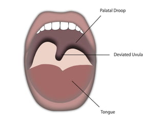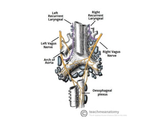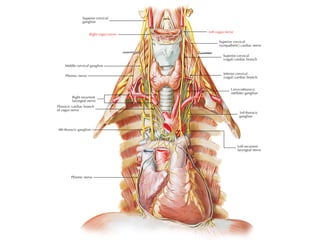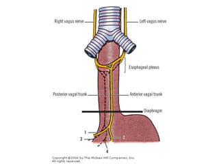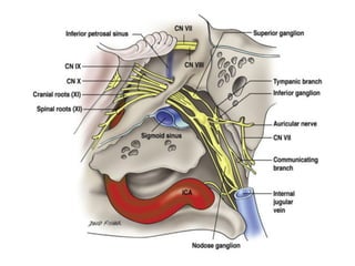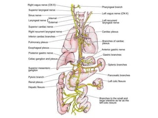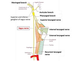 The vagus nerve is the 10th cranial nerve that has both motor and sensory components. It arises from the medulla and has an extensive distribution through the head, neck, thorax, and abdomen. It provides both parasympathetic output and visceral sensation. Some key functions include innervating the pharynx, larynx, heart, lungs, esophagus and stomach. Lesions can cause hoarseness of voice, dysphagia, or loss of gag reflex depending on the location along the nerve.