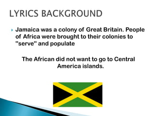 The document summarizes the history of immigration from Africa to Jamaica. It describes how Africans were brought as slaves to Jamaica to work on sugar plantations under British rule. It then discusses Bob Marley's song "Redemption Song" which tells the story of his mother being taken from Africa as a slave and encourages escaping mental slavery. The song gives strength to overcome suffering and hope for a future of freedom.