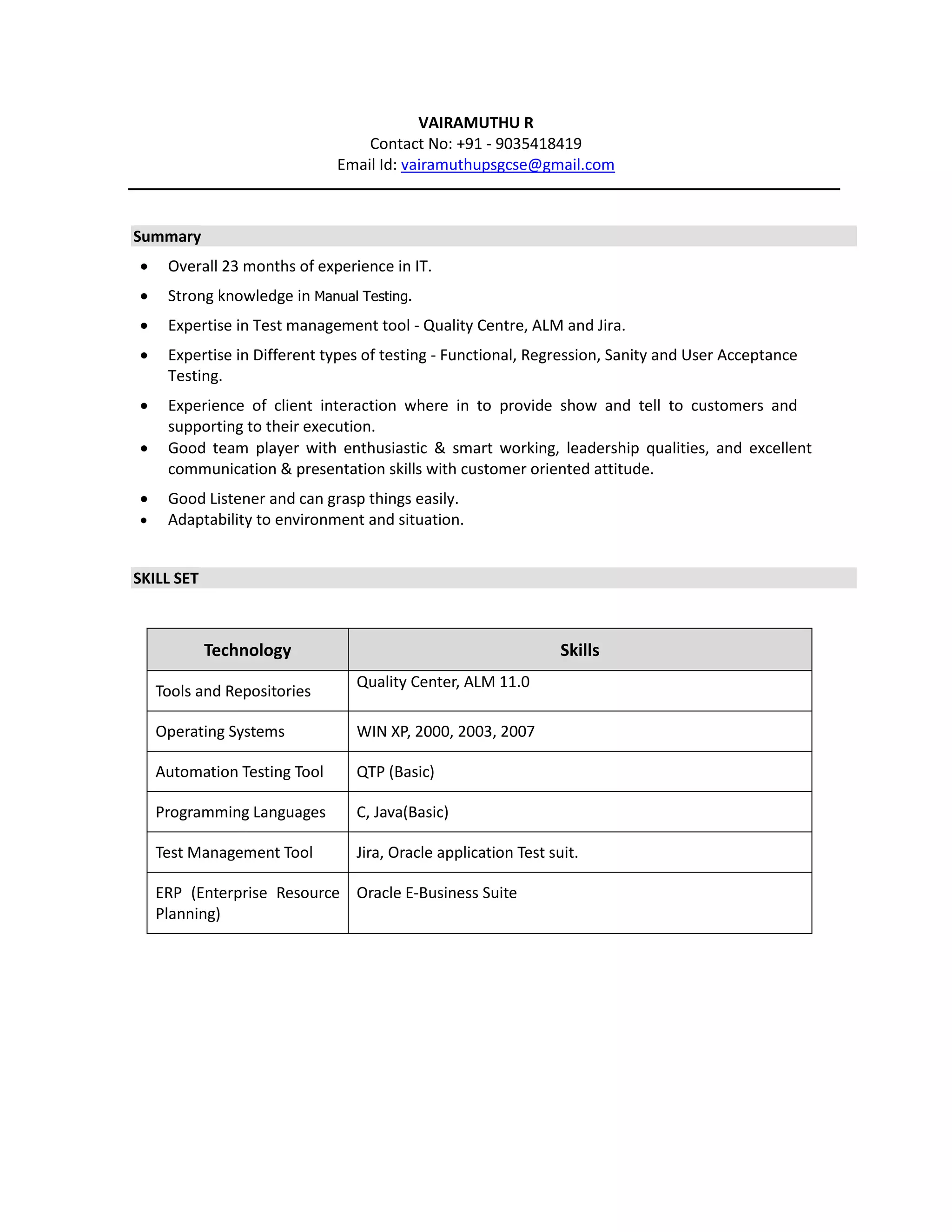 - The document provides a summary and details of Vairamuthu R's work experience and qualifications. It includes over 2 years of experience in manual testing and expertise in test management tools like Quality Centre, ALM and Jira. It also lists his educational qualifications including a B.E degree from PSG College of Technology with 73.1% marks.