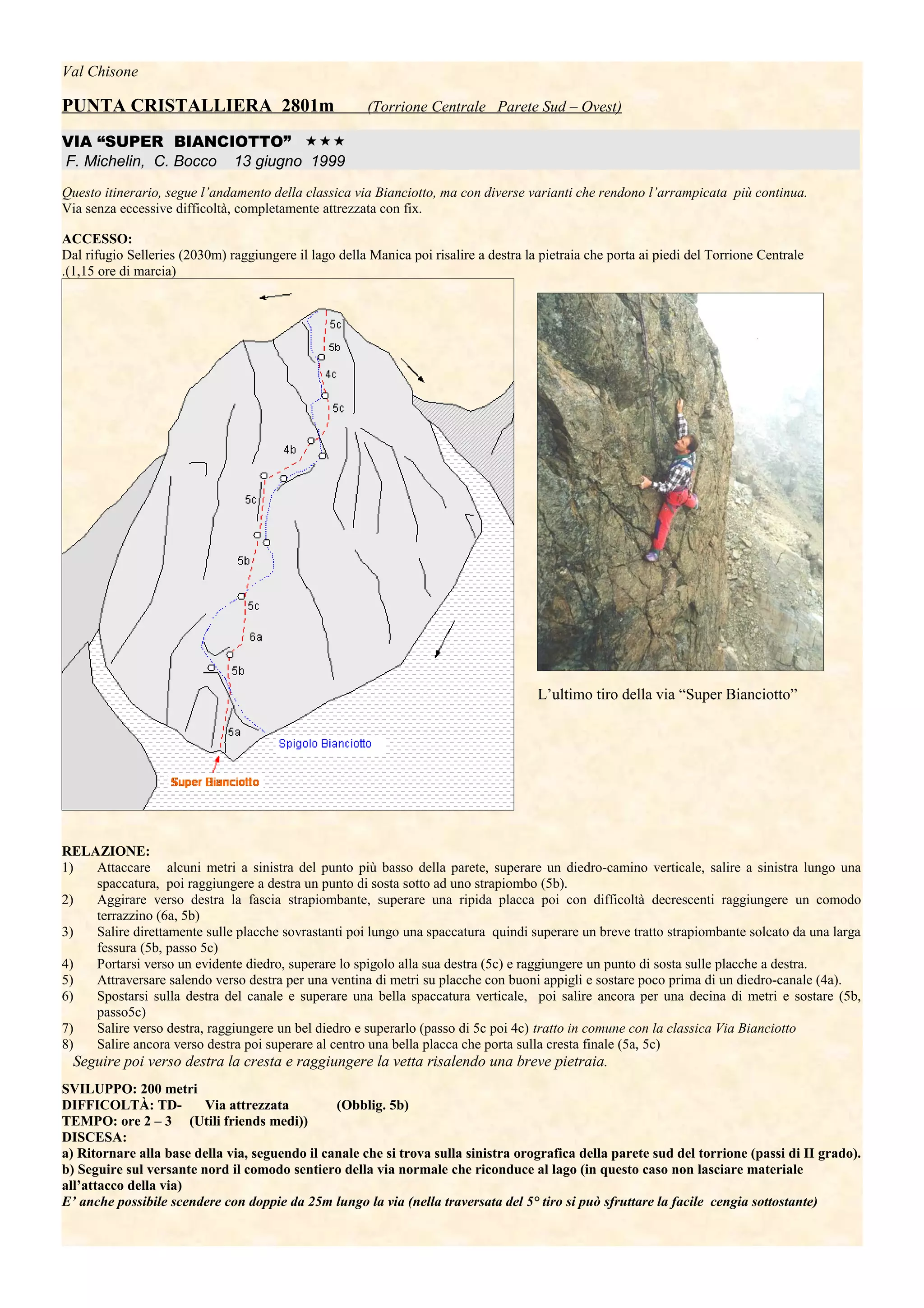 Il documento descrive diverse vie di arrampicata nella Val Chisone, comprese le loro caratteristiche tecniche, accessi e discesa. Le vie variano in difficoltà, lunghezza e attrezzatura, con dettagli specifici su ciascun itinerario. Viene inoltre fornita una descrizione della zona e delle condizioni ideali per l'arrampicata.