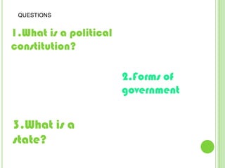 2) Forms of government include federalism where power is shared between central/state authorities, centralism where decisions come from a single authority, despotism where one ruler has absolute power, monarchy where a monarch rules, and democracy where people rule directly or through representatives.