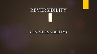 The document discusses the factors that influence human behavior and actions, including internal motivation, methods for achieving goals, objectives, circumstances, and consequences. It also examines evaluating actions based on principles, lessons, and values, as well as the concept of having a consistent standpoint that can be applied universally and potentially reversed in similar situations.