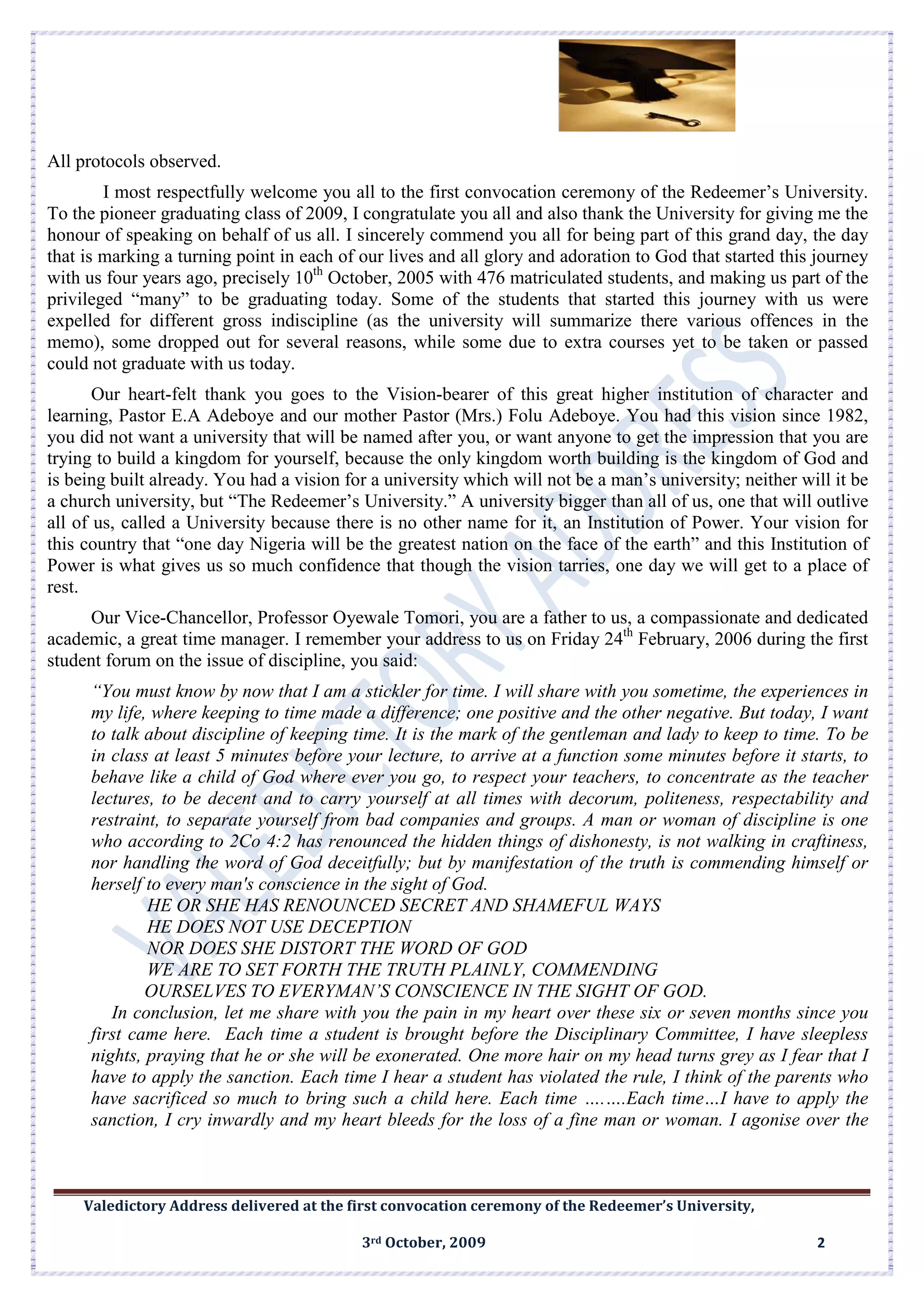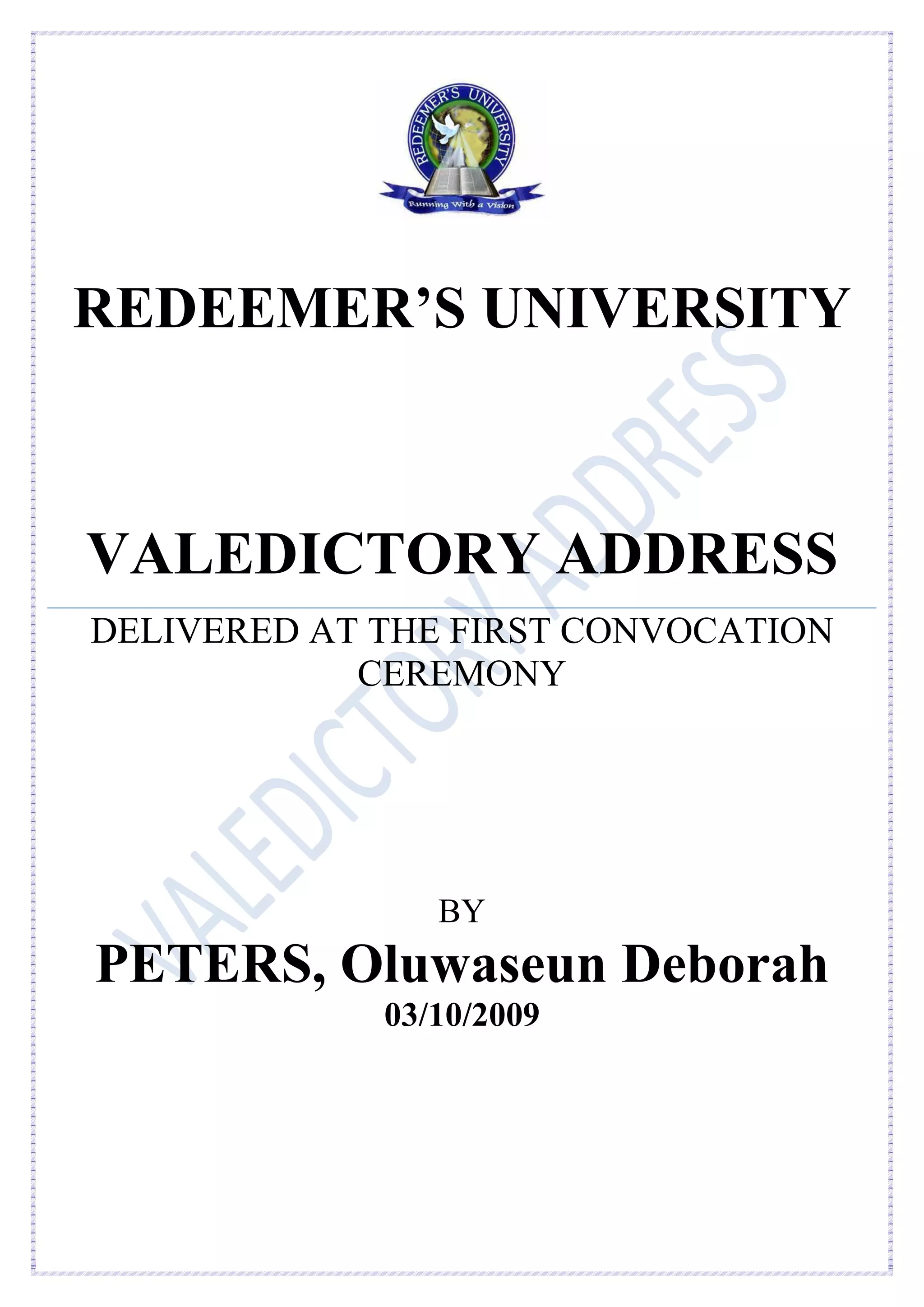 The valedictory address delivered by Oluwaseun Deborah Peters at Redeemer's University on October 3, 2009, celebrates the achievements of the pioneer graduating class. It acknowledges the vision of the institution's founders and expresses gratitude to faculty and staff for their support. The address emphasizes the responsibility of graduates to use their education for positive change in Nigeria and offers encouragement to overcome future challenges with faith.
