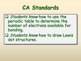 This document discusses valence electrons and how to determine the number available for bonding using the periodic table. It defines valence electrons as those in the outermost shell or energy level available for bonding. It provides examples of how many valence electrons elements in different groups have, from 1 to 8. It also introduces Lewis dot structures as a way to represent an atom's valence electrons and provides examples of Lewis dot structures for period 2 elements.