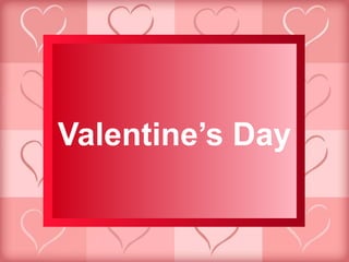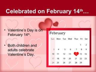 Valentine's Day is celebrated on February 14th to express love and affection. It is named after Saint Valentine, a 3rd century Roman priest who secretly married couples against the Emperor's orders and was martyred on February 14th. To this day, lovers express their love on Valentine's Day by exchanging cards, chocolate, flowers, and gifts. Common Valentine's Day symbols include hearts, Cupid, and romantic poems.