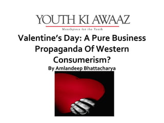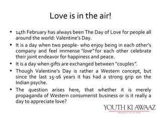 Valentine's Day has become strongly commercialized in India over the past 15-16 years. While exchanging gifts with a romantic partner was once a sign of affection, it has now become more about prestige and consumerism, with companies profiting greatly. However, true love can still be expressed on Valentine's Day by thinking of low-cost ways to make one's partner feel special.